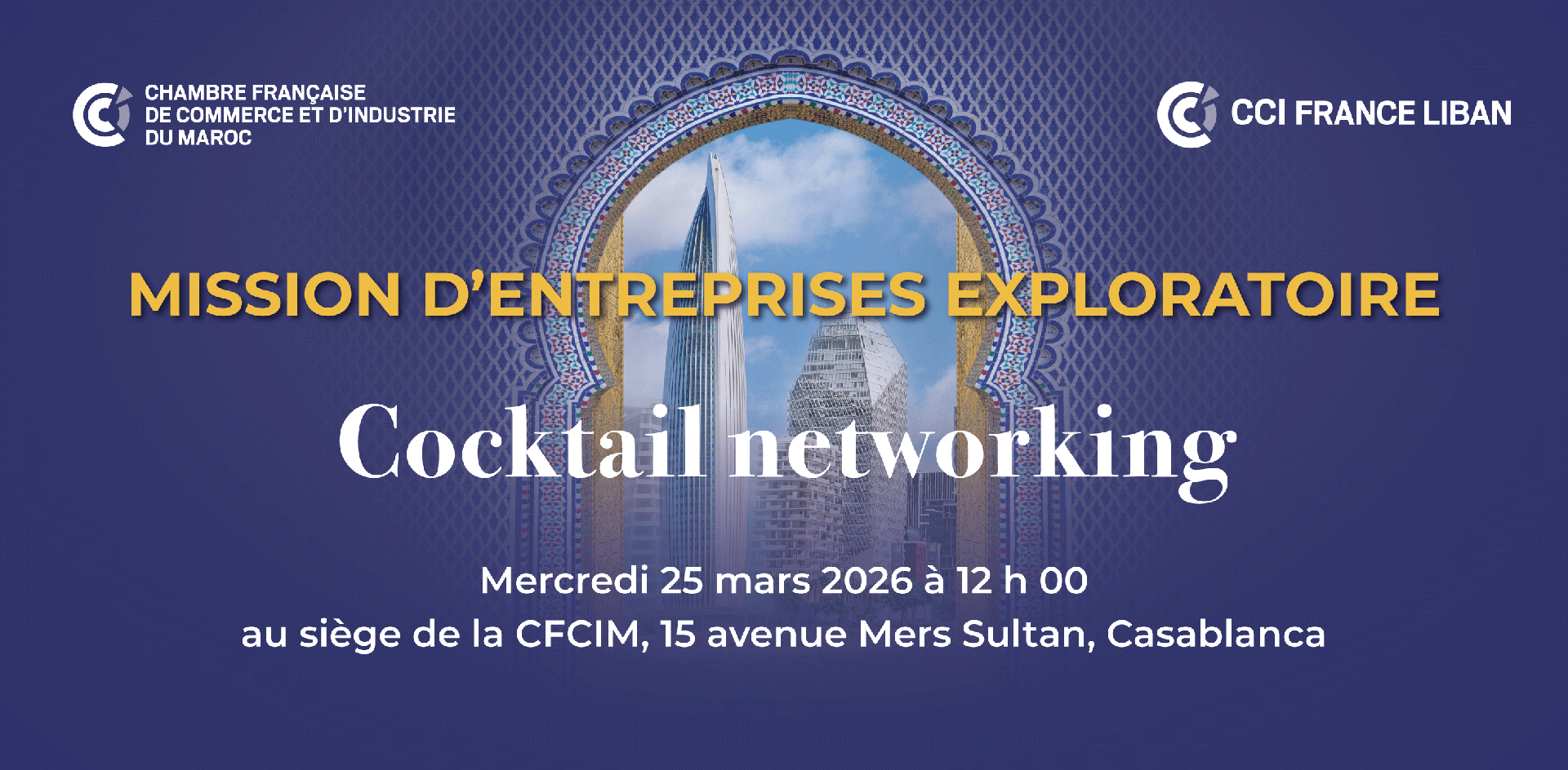 La Chambre Française de Commerce et d’Industrie du Maroc (CFCIM) et la CCI France Liban ont le plaisir de vous convier au Cocktail networking, mercredi 25 mars 2026 au siège de la CFCIM.