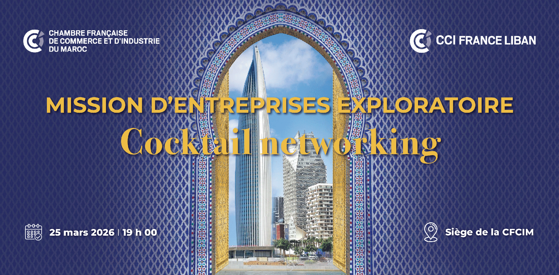 Dans le cadre de la mission exploratoire d’entreprises au Maroc, conduite par Monsieur Maxence Duault Président de la CCI France Liban, la Chambre Française de Commerce et d’Industrie du Maroc (CFCIM) et la CCI France Liban ont le plaisir de vous convier à un Cocktail Networking, le 25 mars 2026 à partir de 19h00 au siège de la CFCIM
