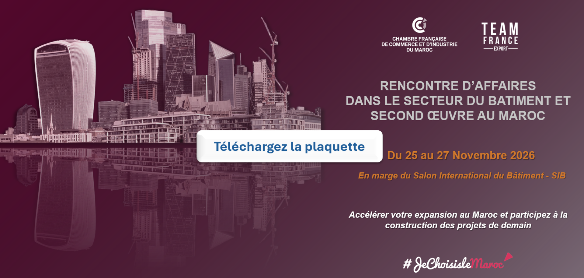 La Chambre Française de Commerce et d'Industrie du Maroc (CFCIM) et la Team France Export (TFE) organisent une Rencontre d’affaires dans la filière bâtiment & second œuvre au Maroc du 25 au 27 novembre 2026.