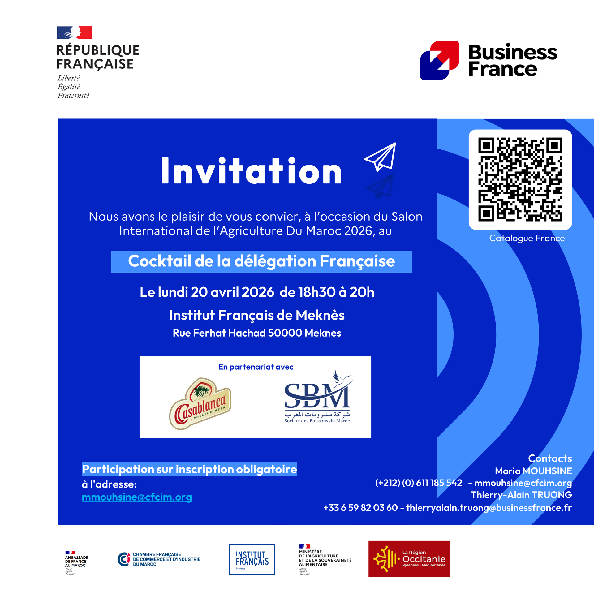 À l'occasion du Salon International de l'Agriculture du Maroc 2026, Business France a le plaisir de vous convier au cocktail de la délégation Française le lundi 20 avril 2026, de 18h30 à 20h, à l'Institut Français de Meknès.